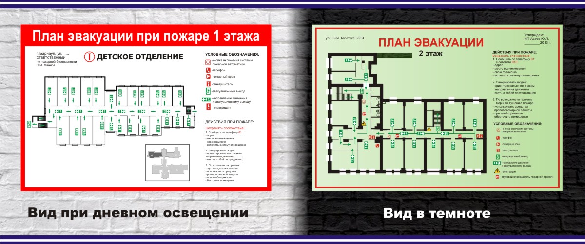 С 01.05.2022 года при разработке и изготовлении планов эвакуации для помещений необходимо руководствоваться ГОСТ 34428-2018 “Системы эвакуационные фотолюминесцентные). Данная технология изготовления позволяет видеть информацию на плане при выключении освещения. Специальная пленка накапливает свет о отдает его, в последствии, в течении нескольких часов.