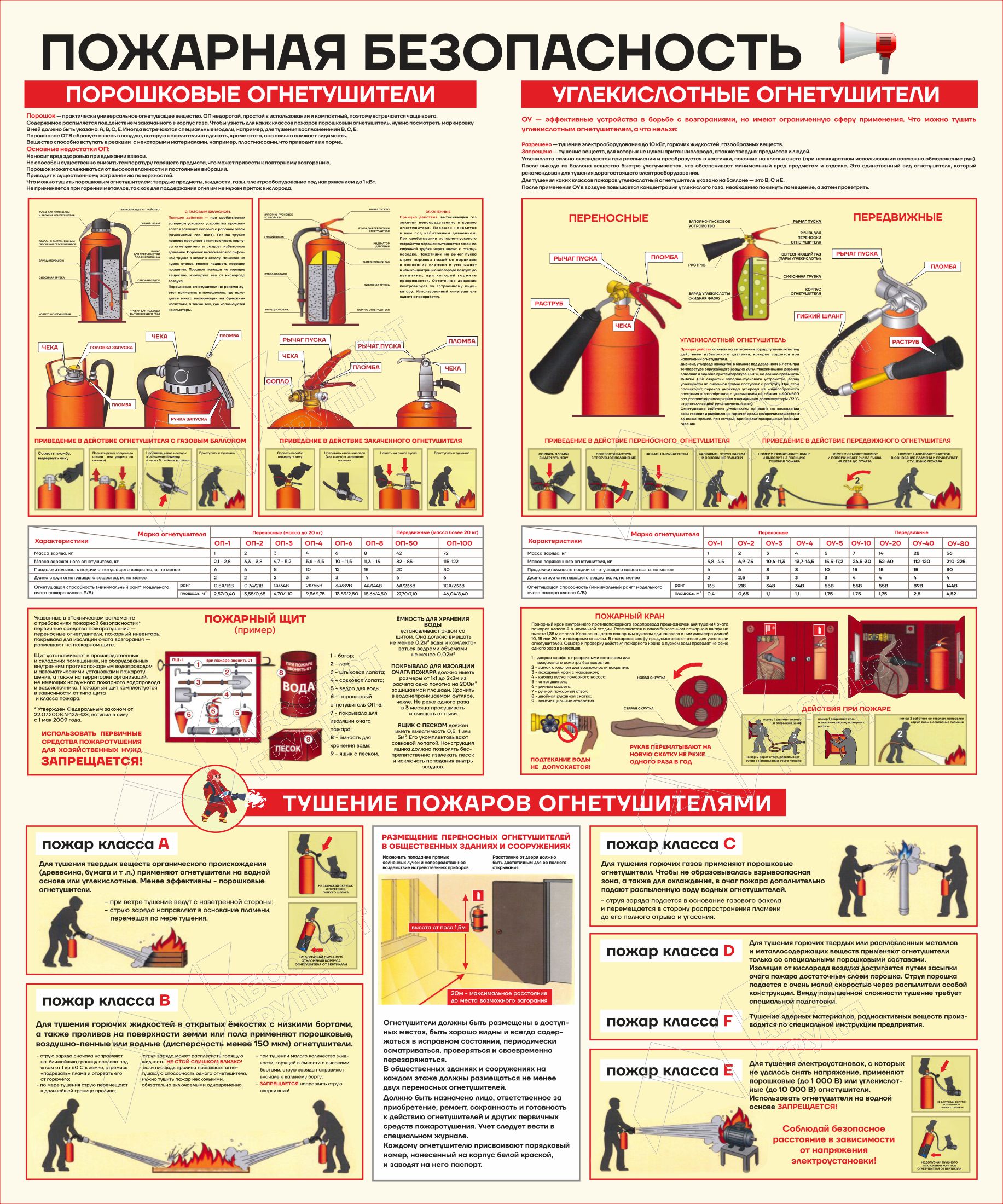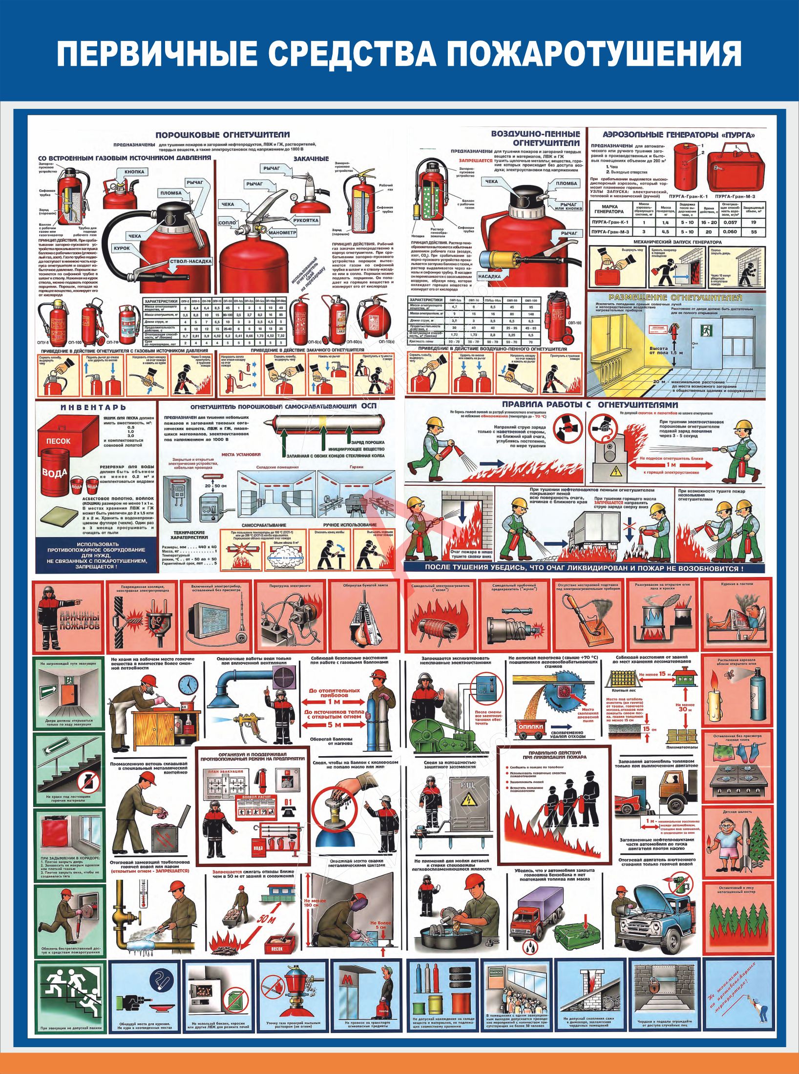На стендах располагается нужная информация о первичных действиях при возникновении пожара, правил эвакуации, инструкции по применению огнетушителей, инструктаж работников учреждений и прочая полезная информация.