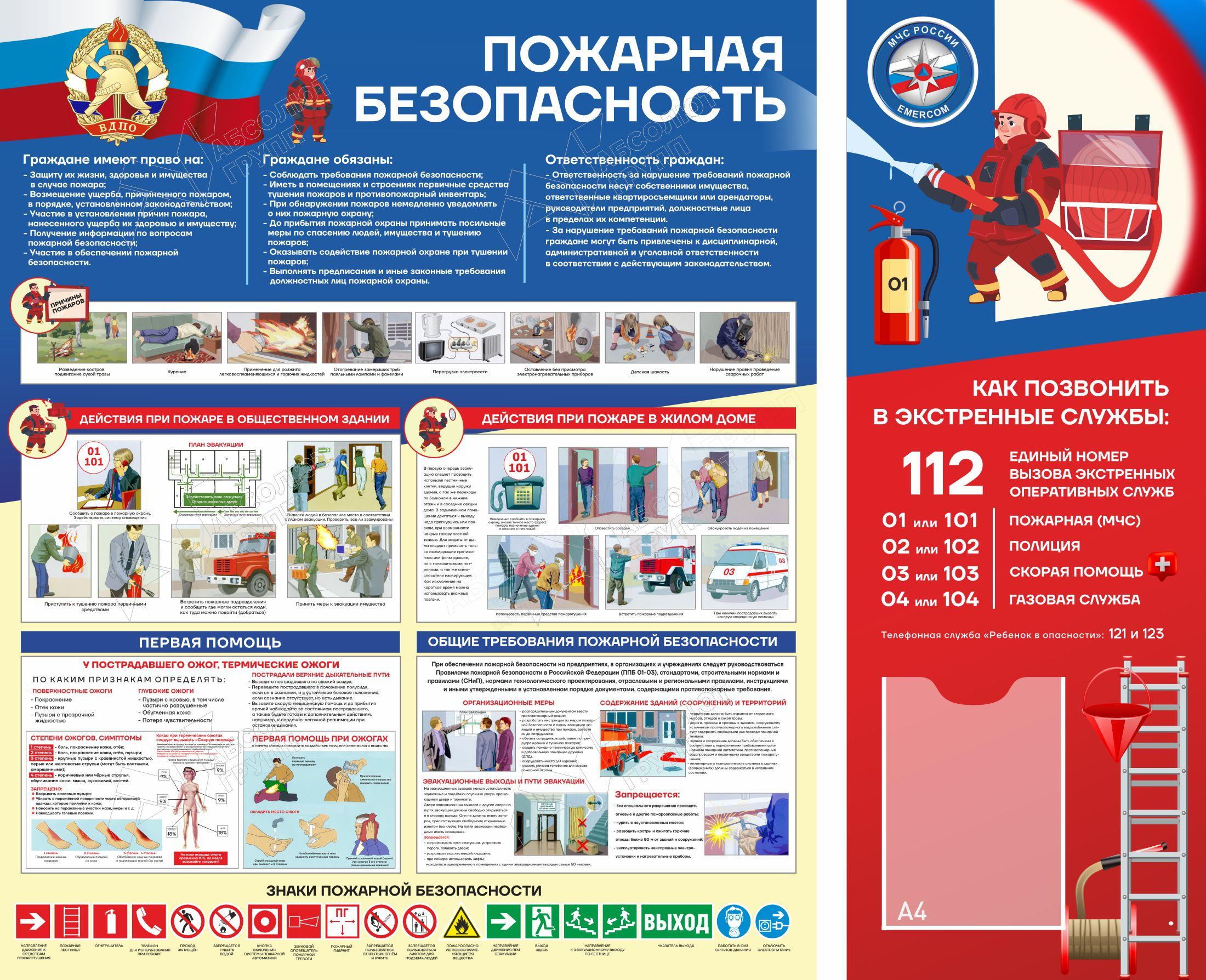 Информационные стенды с правилами по обеспечению требований и мер пожарной безопасности зданий, в учреждениях и организациях для взрослых и детей в школе и детском саду — ДОУ.